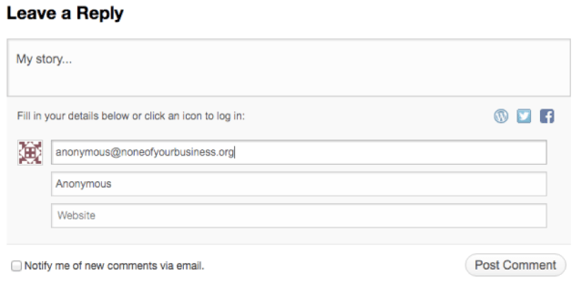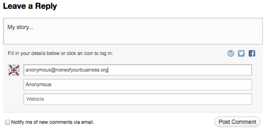 If you would like to offer your story anonymously, we honor that. We work and pray for a day when our anonymity is no longer necessary. In the name and email fields of the comment section below, simply use:
